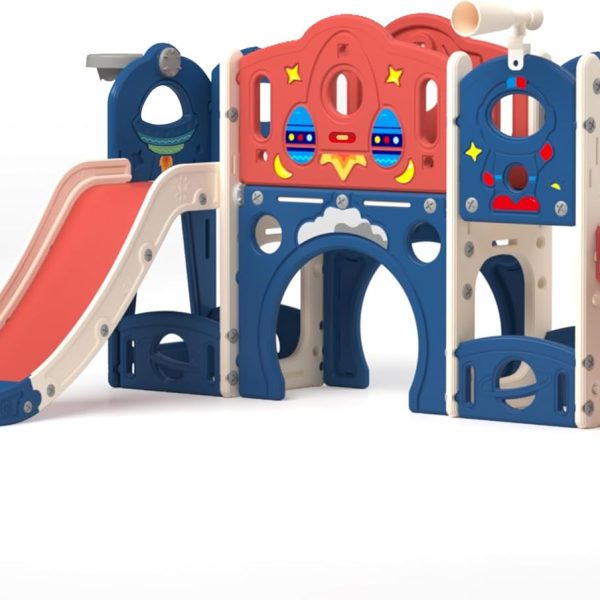 • 【9-in-1 Family Amusement Park】: This toddler slide cartoon design skillfully combines slides, climbing stairs, aisles, basketball hoop, telescope, hide and seek game and secret space to create a comprehensive playground for your kids. Your baby can enjoy a memorable childhood at here